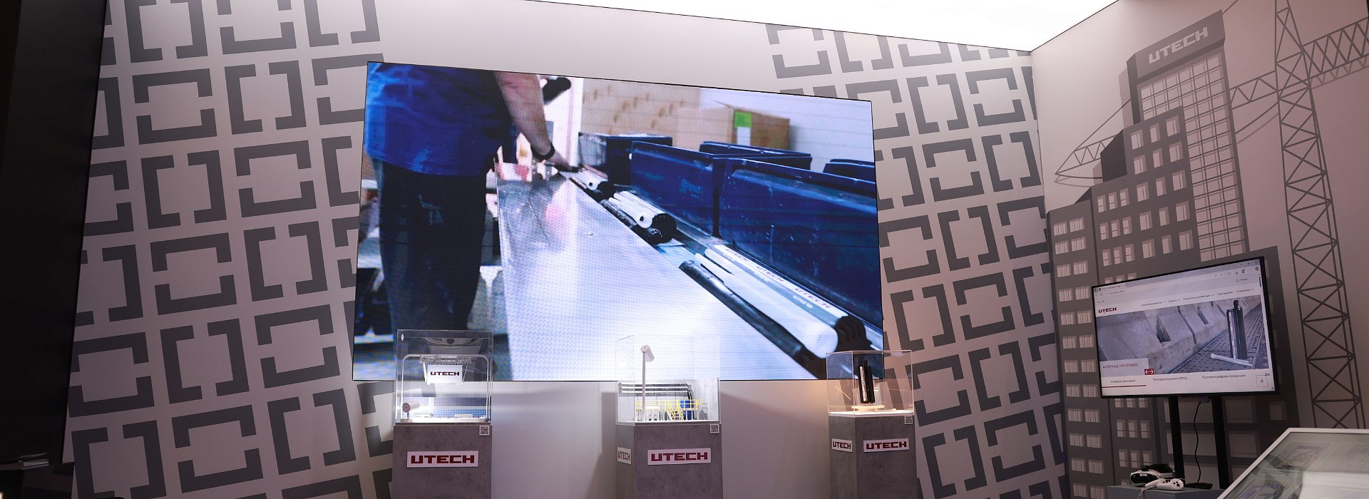 В визуальных стеллах размещены макеты материала FRP. Благодаря своим уникальным свойствам он уже нашел применение в различных отраслях и используется в проектах, где есть специальные требования по агрессивным средам, включая влажность, химические реагенты и автомобильные жидкости, или требования к весу. Также в экспозицию вошла модель медиакуба, созданного для Ледовой арены в Новосибирске. Несущие конструкции медиакуба спроектированы с использованием монтажных систем UTECH. Это обеспечило надежность, безопасность и оптимальные сроки реализации проекта – ключевые факторы при строительстве объектов спортивной инфраструктуры.
