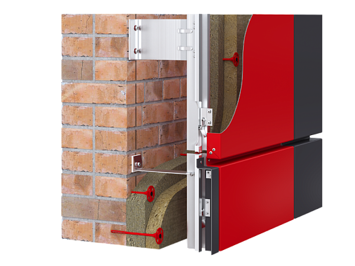 Конструкция навесной фасадной системы с воздушным зазором "VFH Composite" для облицовки кассетами из композитных и металлических листов, металлическими и композитными листами, сайдингом и профилированными металлическими листами, а также утепления наружных стен зданий и сооружений различного назначения. Разработано и произведено в Росси
